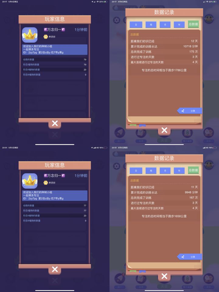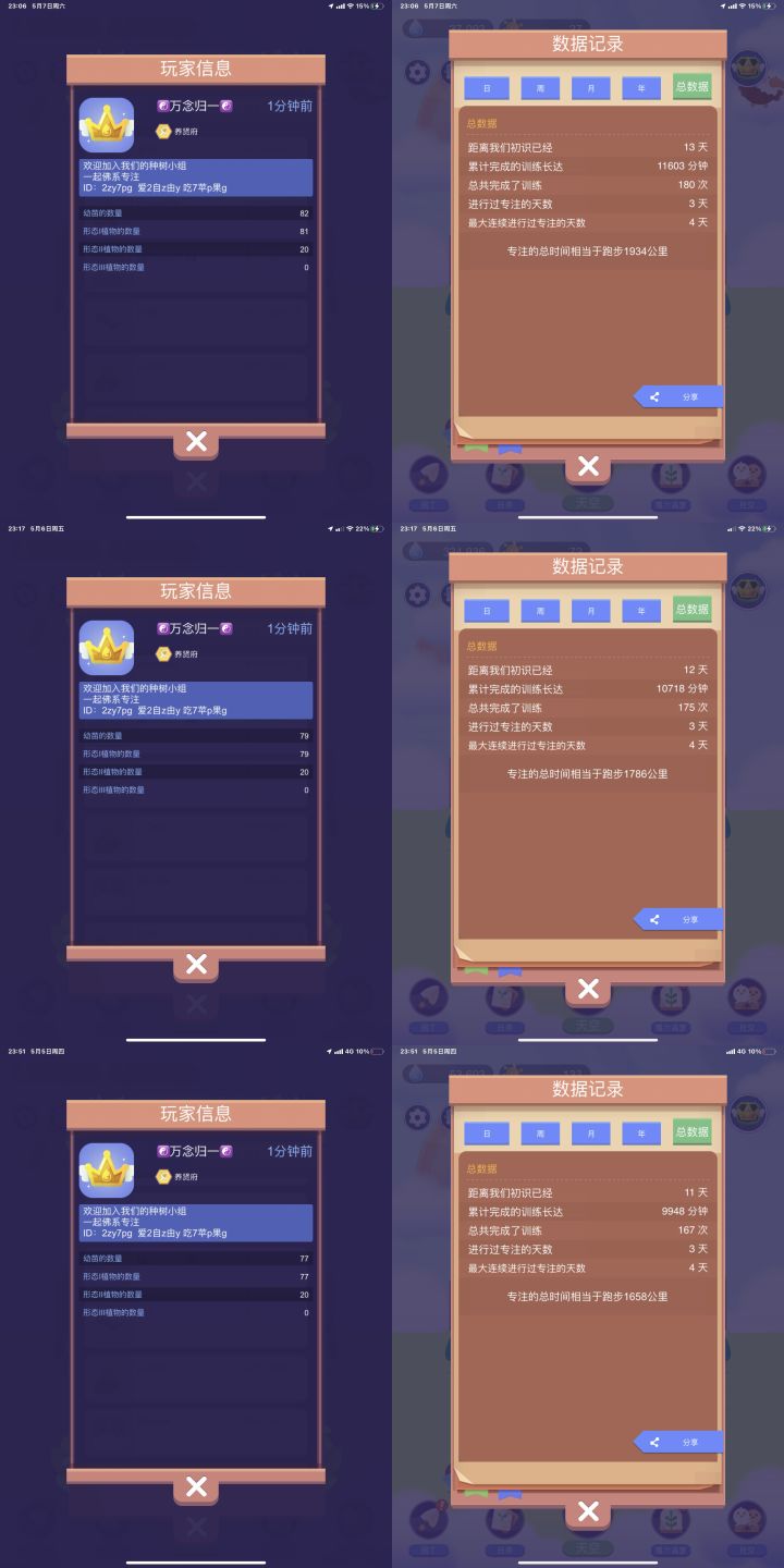 【时间花园】第10天,收集进度74棵(+3)。今天摸索出一条攻略经验,在朝阳猫的两年前攻略基础上,有些玩法发生了改变,园丁可以个性化培养,开了宝箱后,先将所有园丁都分解成园丁卡,优先将所有园丁卡导入增加专注水滴💧的绿色园丁,其次是增加专注水滴💧的蓝色园丁。绿色园丁和蓝色园丁性价比相同,收益最差的其实是紫色园丁,三倍的园丁卡换来两倍提升效果,建议升完绿色蓝色园丁,再升紫色园丁