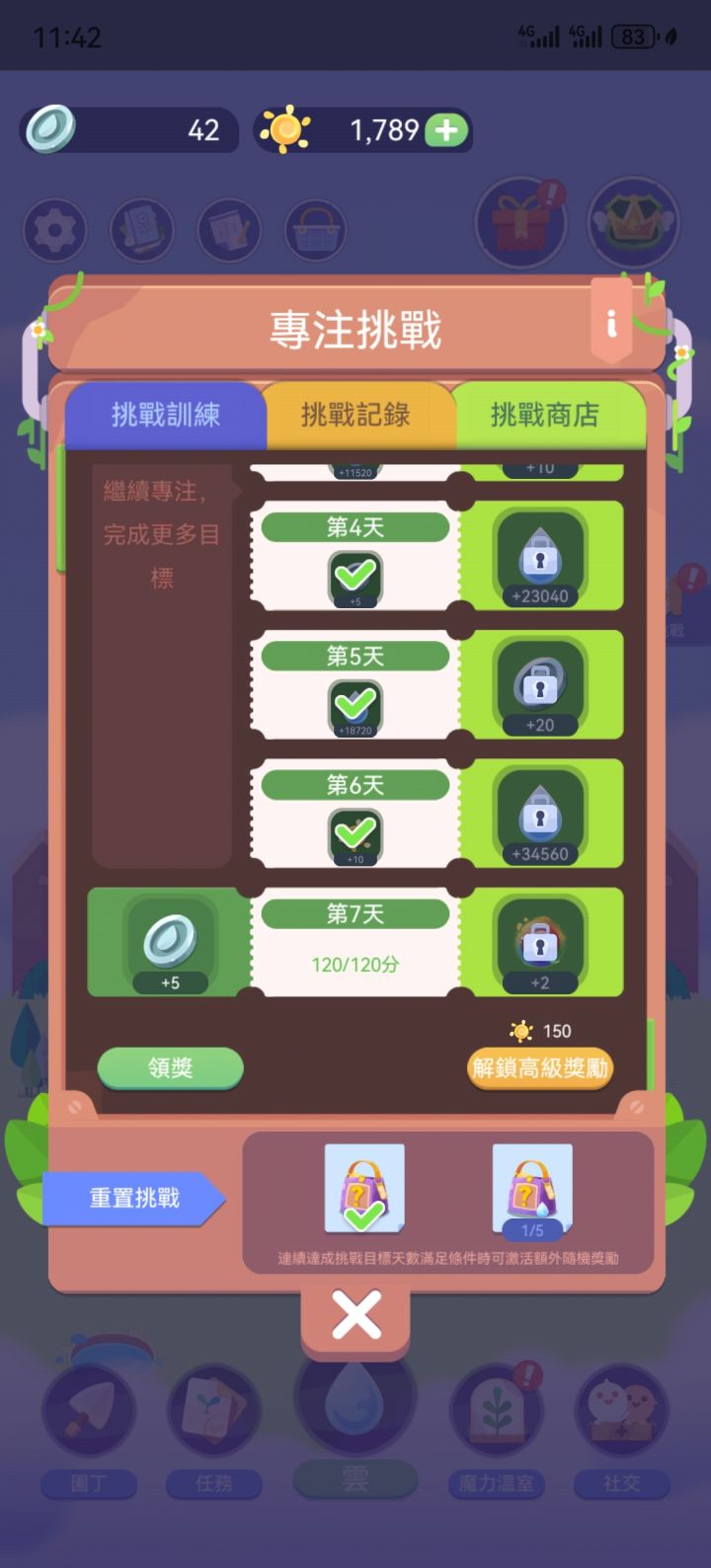 时间突然错乱了,一次我离开专注模式的时候没结算奖励,然后我的全勤(就是那个新出的专注奖励)明明每天都完成了却判断只完成了一天,任务莫名其妙刷新了完成次数。这简直逼死强迫症好吗