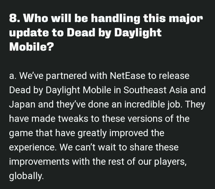 此为dbd mobile官方推文,时间为18h之前。大意是:谁讲获得一次动画和服装的升级?翻译成人话:oni会有新的服装与动作接着,评论区里有个人发了一个视频(有点糊,将就看)从视频可知,视频里的oni是网易繁中服的。那发光冒气的刀,不用想就是网易的美工做的,同时,这个新动作为网易独有的处决动作。由这两点我们可以确定,国际服真的会和网易服合并。(以下为个人猜测)以猪场的尿性,会做华丽