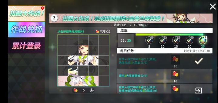 我拼图貌似有两天是异常的,第一天和今天,都是有任务领取了进度又不增加,特别是今天,3个任务做完了就是不加...萌新成长就更厉害了,每打完一首歌都提示我完成了25个任务,但它就是卡在24,你说难不难受..