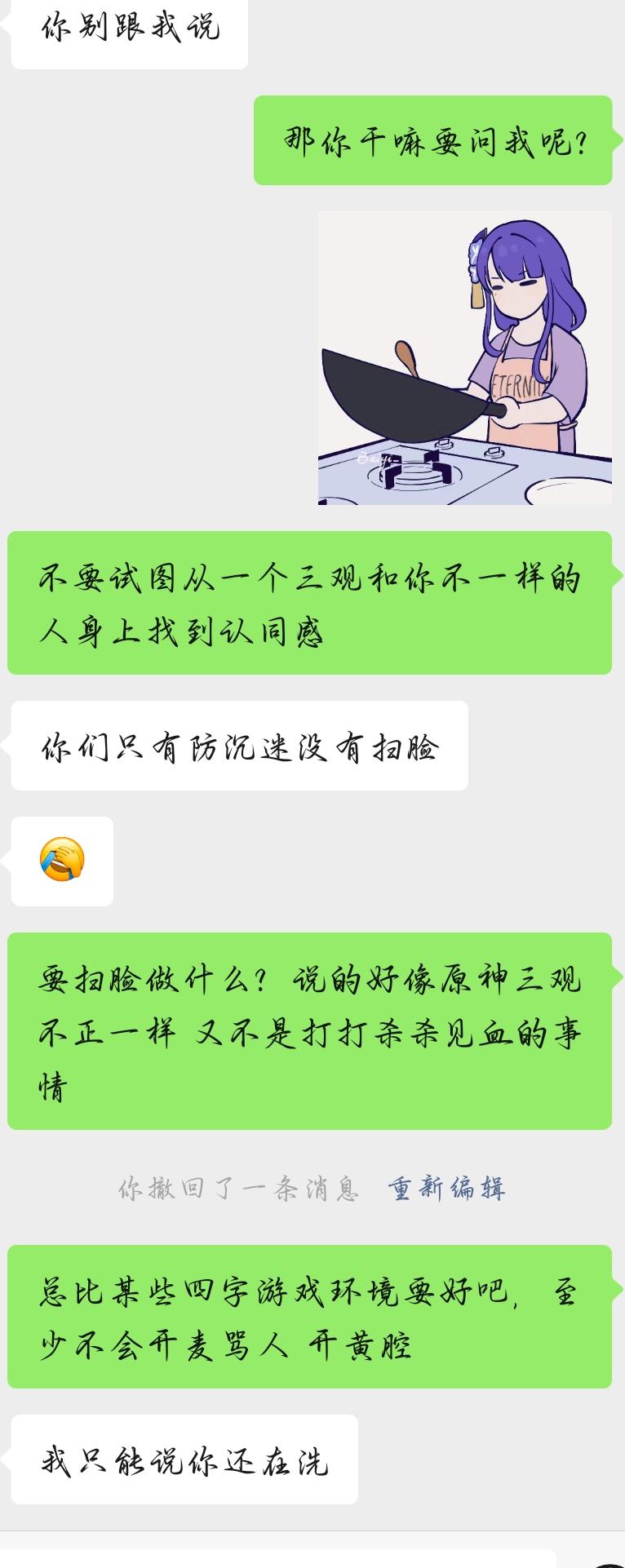 我一个入坑原神的朋友居然跟我说我在洗白,他喵的洗白个鬼,说的好像是没有防沉迷一样 说的好像现在哪个氪金不需要密码一样孩子玩会游戏怎么了 大人有的时候在餐桌上都还打斗地主呢