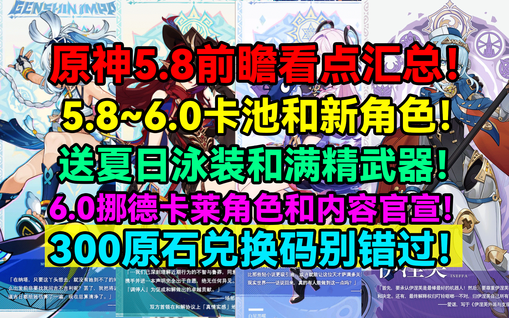 UID:148658053 原神5.8前瞻看点汇总!5.8~6.0卡池和新角色!送夏日泳装和满精武器!5.8原石福利汇总!6.0挪德卡莱角色和内容官宣!300原石兑换码!全网首发全汇总!