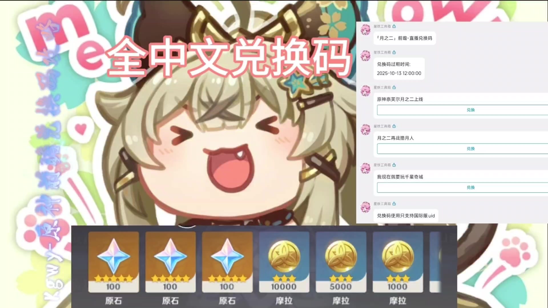 uid:100047993今天原神发布了月之二版本前瞻,不仅公布了新角色和新剧情,还详细介绍了原神UGC玩法,让我们一起来看看新版本都有什么内容吧月之二版本更新时间:10月22号(以官方公告为准)本次兑换码为中文兑换码。第一个兑换码:原神奈芙尔月之二上线第二个兑换码:月之二再战猎月人第三个兑换码:我现在就要玩千星奇域兑换码数量和兑换时间有限,大家尽快兑换。国际服兑换码也附上(奖励内容与国服一致