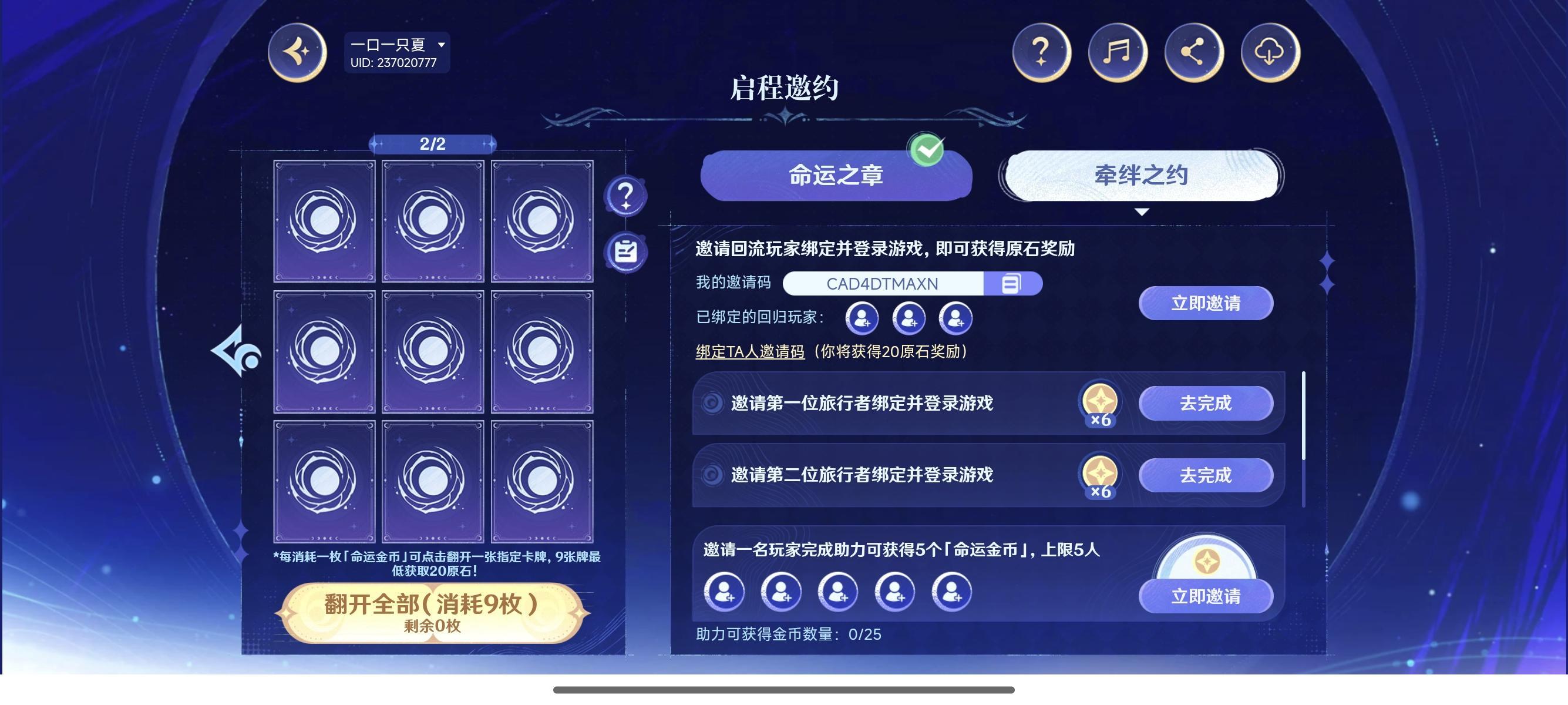 有没有好心人帮帮忙绑下我的码!可以互助!接受命运的邀约,一起探索「月之一」新版本,参与活动必得原石,还可翻牌获取海量好礼!邀请码:CAD4DTMAXN,https://mhyurl.cn/ACHEaGCHy?m_code=CAD4DTMAXN#游戏日常