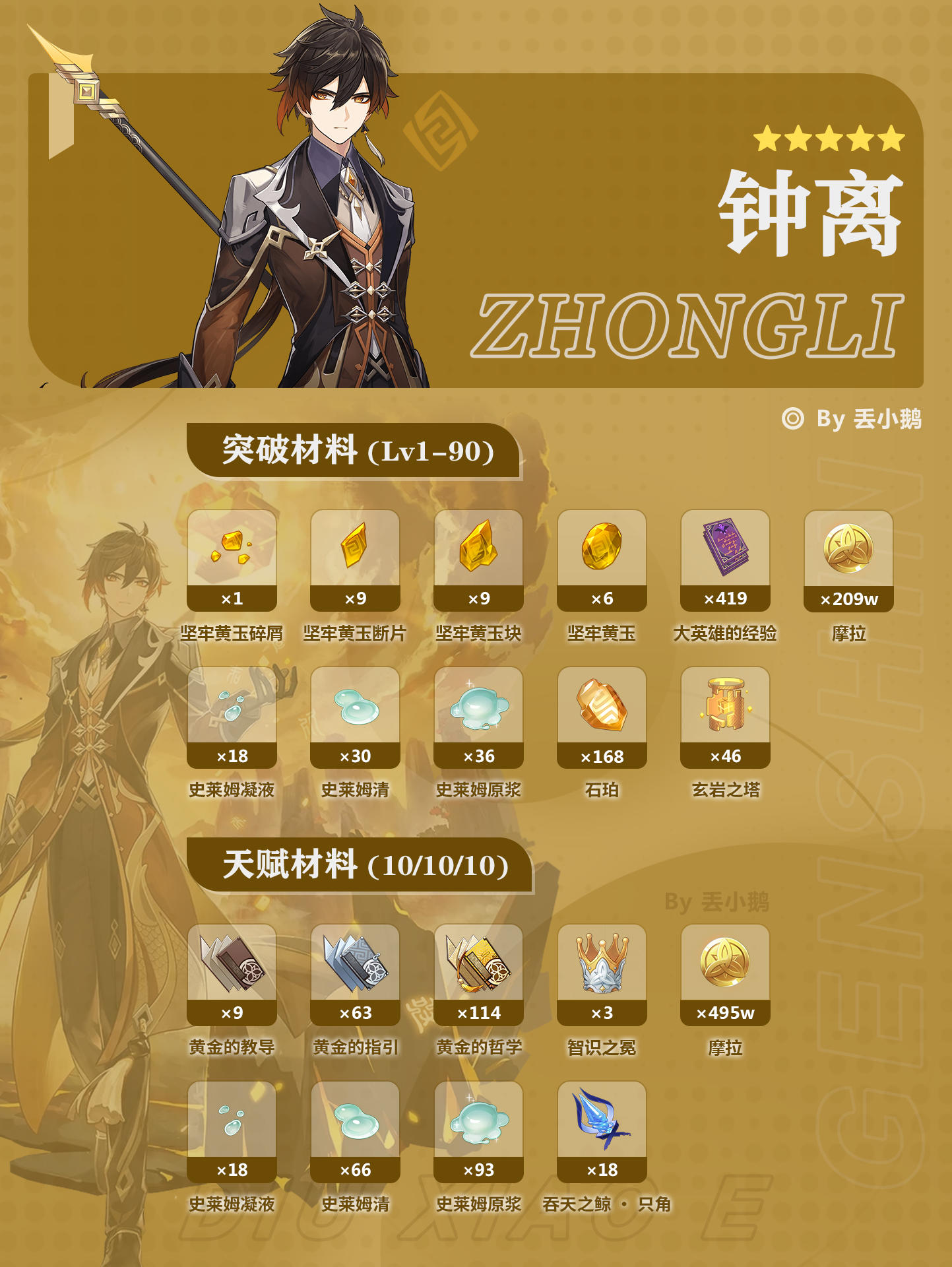 UID:185889661hi各位旅行者们大家早上中午晚上好呀,这里是为大家带来版本角色攻略的青枫本期为大家整理「钟离」的角色攻略,他是被「往生堂」请来的神秘客人,知识渊博,对各种事物都颇有见地。接下来以图鉴的形式简要解析「钟离」的养成参考,帮助大家快速了解角色及后续培养方向;▌图鉴概述目录1、角色信息板块:角色背景介绍、LV90属性面板、神之眼类型、命座名称、武器类型、等级突破素材、角