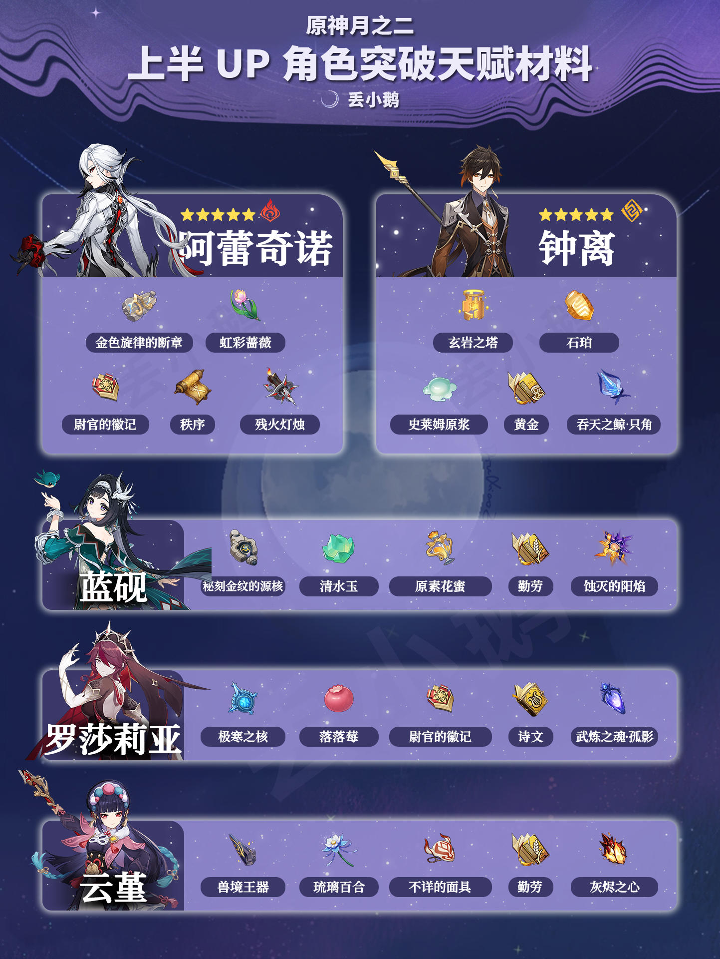UID:220052599旅行者好,我是丢小鹅~为你带来【原神月之二】上半Up角色突破/天赋材料~⭐️ 月之二上半:奈芙尔(新)、芙宁娜、行秋、柯莱、瑶瑶● 元素石 ●获取方式:* 首领挑战奖励* 周本挑战奖励* 纪念品商店兑换* 合成台转换:如有其它元素材料,可在合成台转换(合成材料嬗变之尘获取方式:游戏商城 - 尘灰兑换 - 星辰兑换)● 区域特产 ●获取方式:* 方法