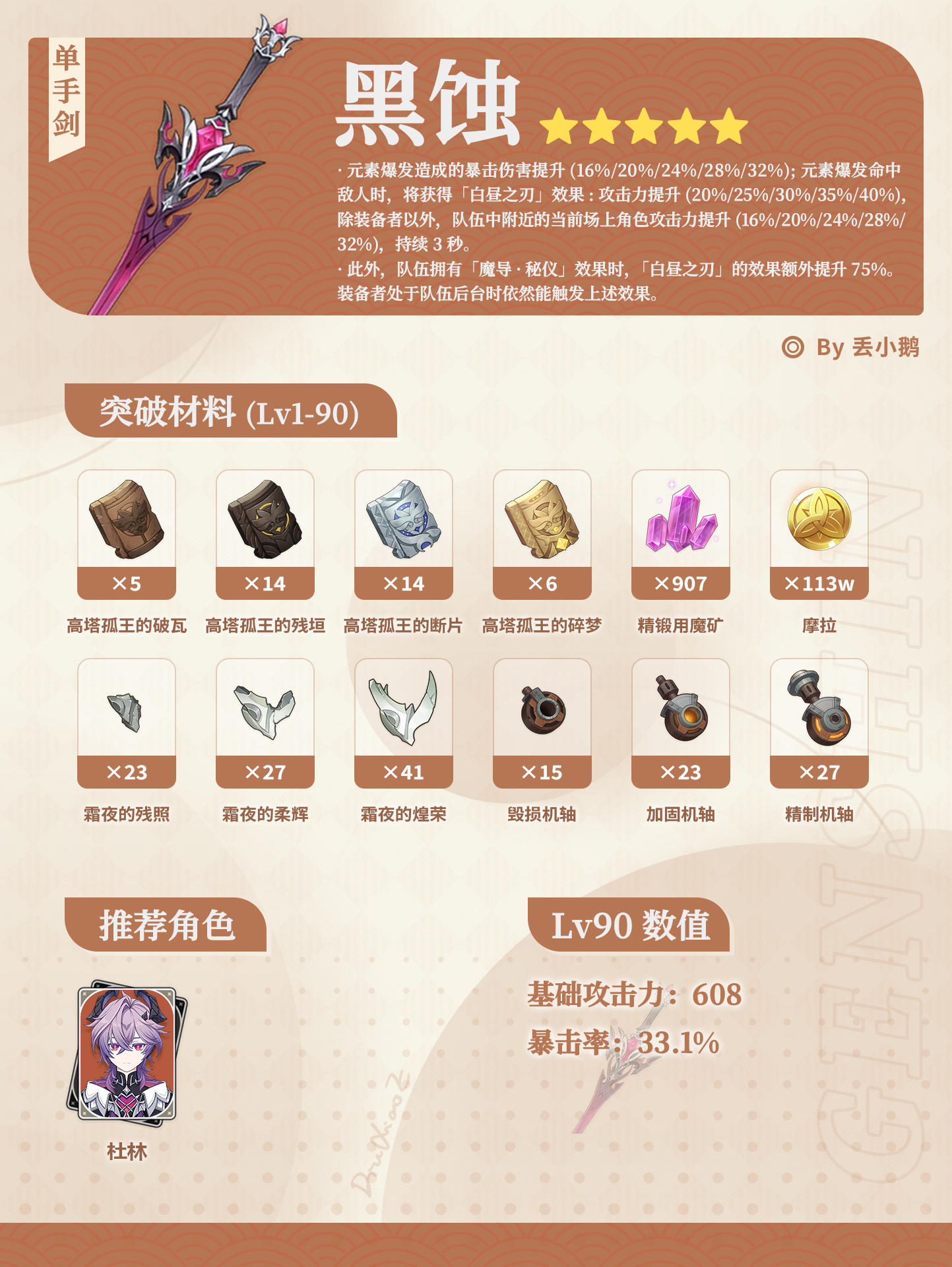 UID:220052599旅行者,你来啦~我是丢小鹅,为你带来原神「月之三」上半Up武器突破材料~● 5星武器:「单手剑·黑蚀」(新)、「弓·黎明破晓之史」(新)● 4星武器:「单手剑·暗巷闪光」、「长柄武器·勘探钻机」、「法器·暗巷的酒与诗」、「双手剑·雨裁」、「弓·绝弦」#原神 #原神攻略 #原神创作者激励计划 #原神空月之歌 #原神月之三 #杜林 #温迪