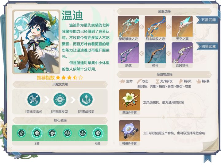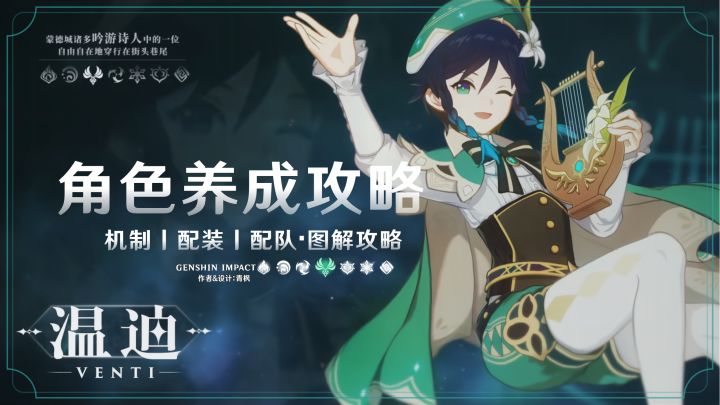UID:185889661hi各位旅行者们大家早上中午晚上好呀,这里是为大家带来版本角色攻略的青枫本期为大家整理「温迪」的角色攻略,他是蒙德城诸多吟游诗人中的一位,自由自在地穿行在街头巷尾。接下来以图鉴的形式简要解析「温迪」的养成参考,帮助大家快速了解角色及后续培养方向;✦角色简介✦✦『高天的歌者』·温迪(风),是一位具备强力牵引并持续进行扩散反应的风元素角色。短按元素战技在敌人所在的