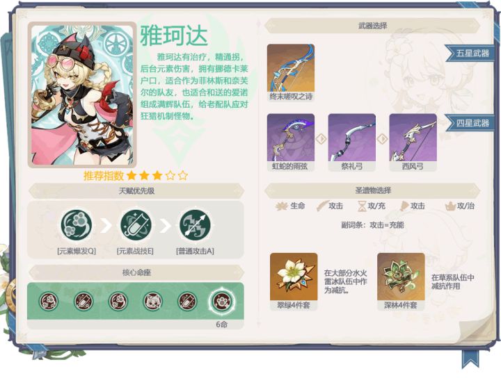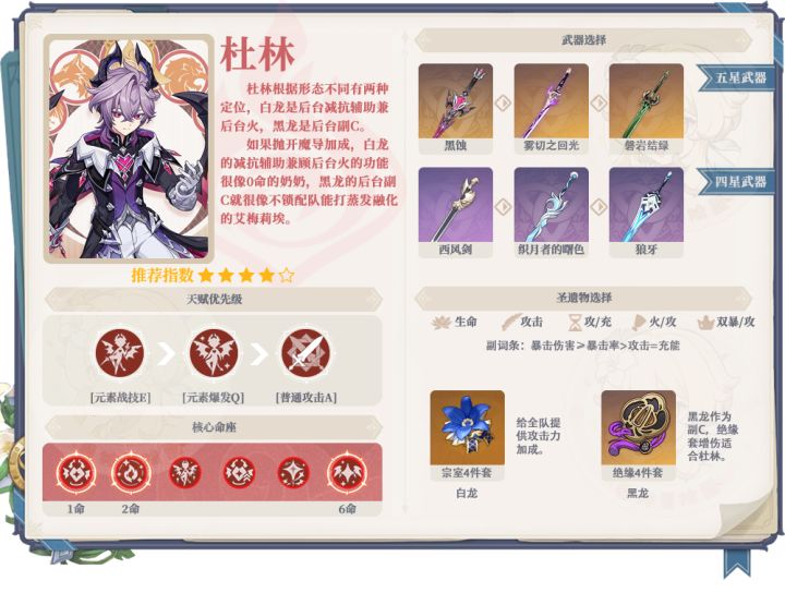 uid:100047993本期攻略为新卡池5个角色的抽取建议和快速培养指南,希望对你有所帮助。一:五星角色1、杜林推荐指数:4星加点:E=Q>A命座总结:1、2、6命为核心命座。武器选择:黑蚀、雾切之回光、磐岩结绿、天空之刃、西风剑、织月者的曙色狼牙【昔日宗室之仪】:(白龙)2件套: 元素爆发造成的伤害提升20%4件套: 施放元素爆发后,队伍中所有角色攻击力提升20%,持续1