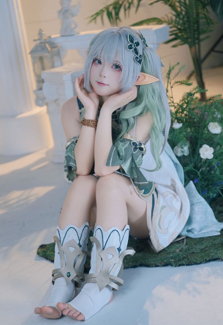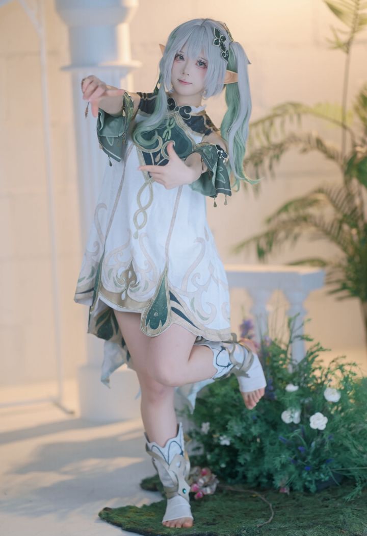 uid:504587464这组纳西妲的cos正片直接把须弥草神的灵动感捏得死死的!造型上,渐变的银绿发丝层次分明,草元素纹样的发饰精准还原角色细节,精灵耳的弧度与面部妆容的适配度拉满,粉色眼尾的晕染既贴合纳西妲的少女感,又衬出眼眸里的清澈灵动。服饰的还原度更是没得挑,浅绿与白的配色还原了角色服饰的清新质感,布料的纹理和装饰的金属件都精致到细节,手腕上的木质手串更是点睛之笔,瞬间拉满角色的辨识度。