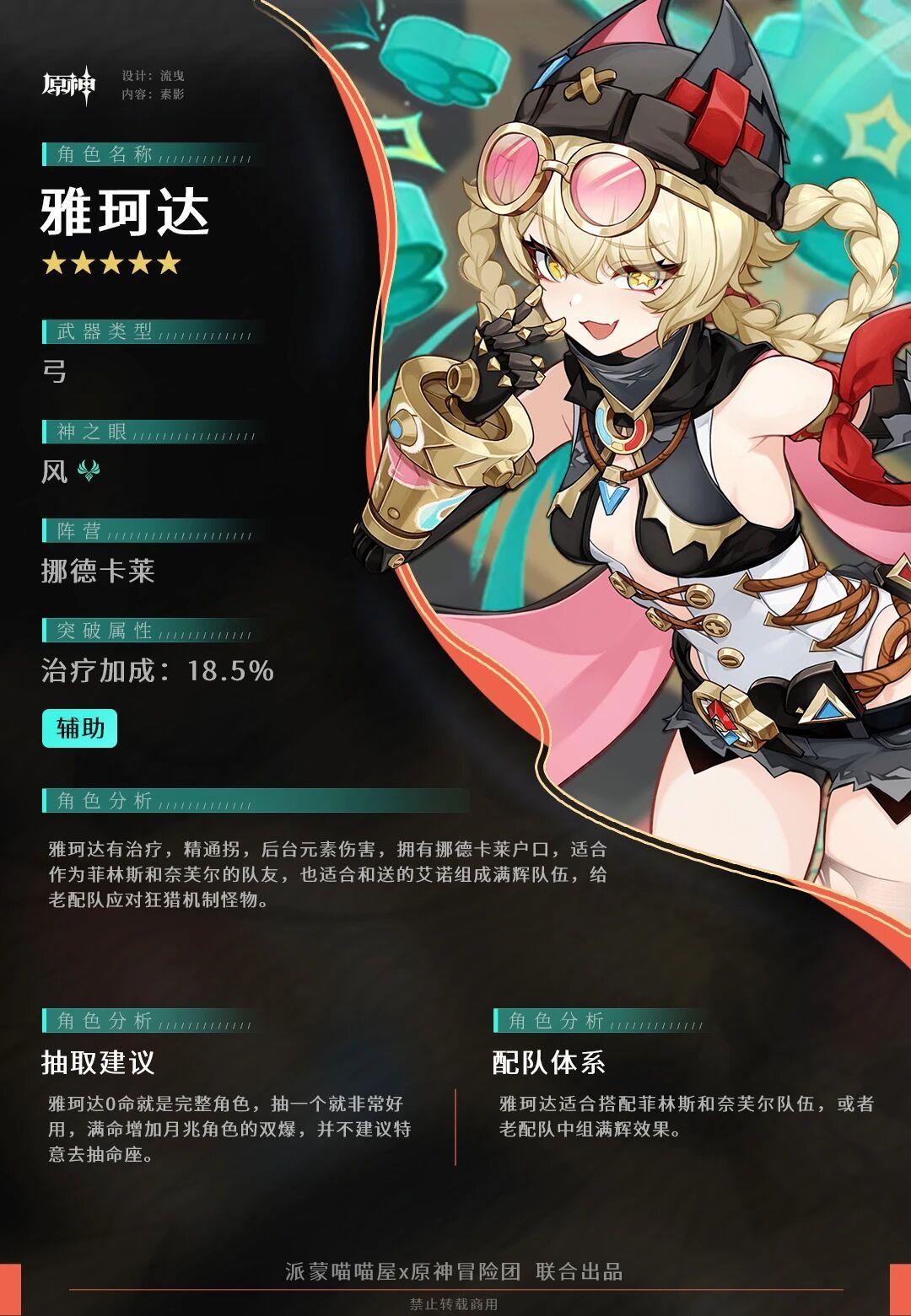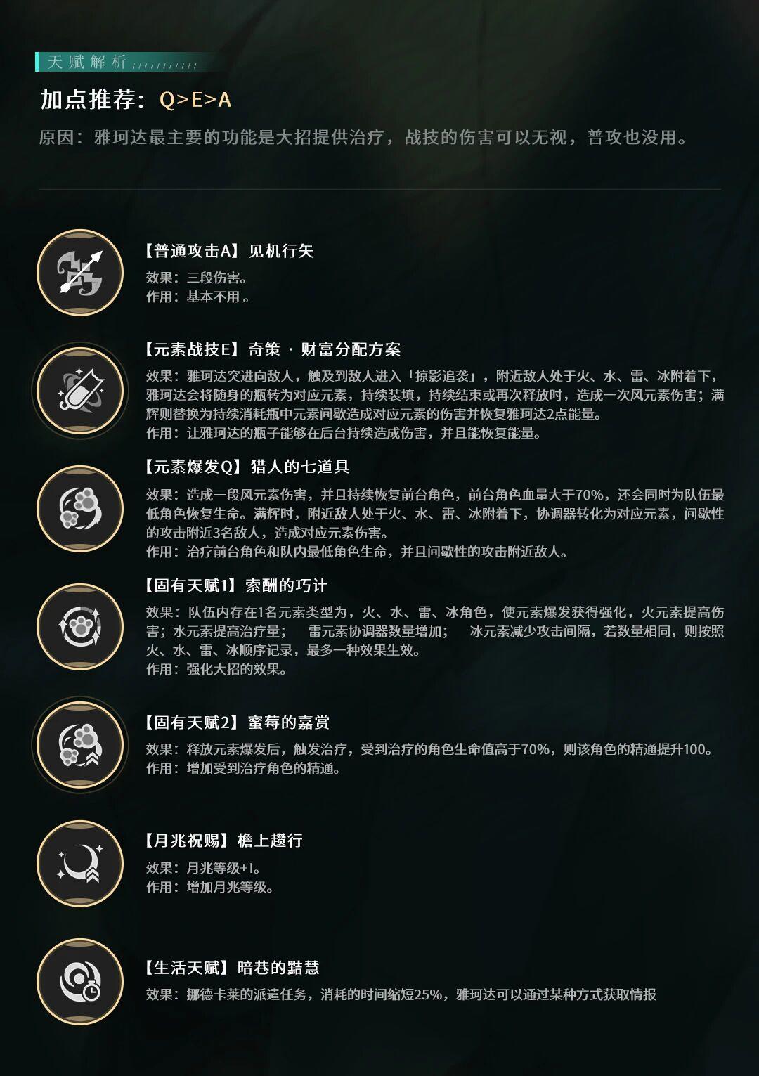 uid:100047993从月之一版本开始,雅柯达就跟着我们解决了一系列麻烦,给大家留下最深刻印象的莫过于她出彩的颜艺了,可爱又老实的性格加上恰到好处的颜艺让她收到了很多玩家的喜爱,她的表情包也是满天飞,一起看看这位表情包主理人要怎么培养吧▌P1 角色定位▌P2 天赋技能天赋分析[普通攻击A]效果:三段伤害[元素战技E]效果:雅珂达突进向敌人,触及到敌人进入「掠影追袭」,持续吸收敌