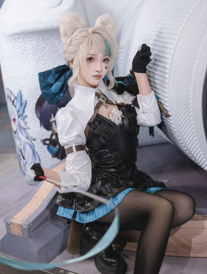 uud:504587464这套cosplay把俏皮灵动的猫娘气质诠释得淋漓尽致!蓬松的兽耳与柔软的尾巴自带萌点,黑白主调的裙装撞入亮眼的湖蓝,搭配复古礼帽与蝴蝶结,既像从童话里走出来的魔法使,又带着英伦女仆的精致俏皮。黑丝与马丁靴的组合平衡了甜腻感,举手投足间都是元气满满的活力。背景的浅蓝鎏金布景与飘带更是点睛之笔,让整个画面在灵动之外,又多了一层梦幻的舞台感,仿佛下一秒就要踩着节拍跳起来。 #