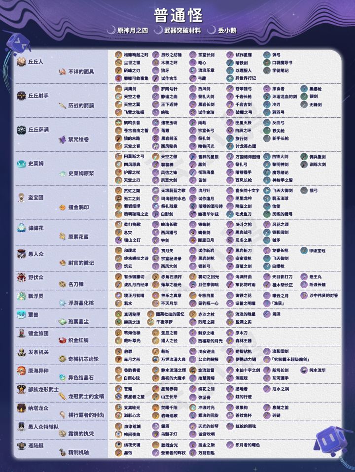 UID:220052599旅行者好,我是丢小鹅~为你带来【原神月之四】全武器突破材料~ ⭐️月之四上半:● 5星武器:「法器·帷间夜曲」(新)、「长柄武器·支离轮光」● 4星武器:「长柄武器·镇山之钉」、「法器·乘浪的回旋」、「弓·幽夜华尔兹」、「单手剑·笛剑」、「双手剑·祭礼大剑」⭐️月之四下半● 5星武器:「单手剑·朏魄含光」(新)、「法器·万世流涌大典」● 4星武器:「单手