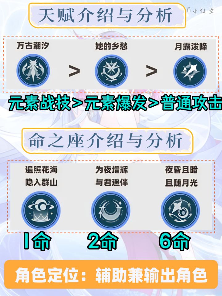 UID:247441820哥伦比娅,是一位可以使队伍同时触发月感电/月绽放/月结晶反应,并兼具持续后台输出和辅助能力的水元素角色。哥伦比娅可以全方面的增幅月反应,提升月反应伤害,还能使月反应获得额外效果此外,战技有着大范围的随身挂水和一定的辅山能-哥伦比娅使全队触发 月感电 月绽放 月结晶反应,自己也能打出月反应伤害、提供月反应增伤、优化月反应效果,绝对的月反应核心!全队月反应、反应增伤、绝