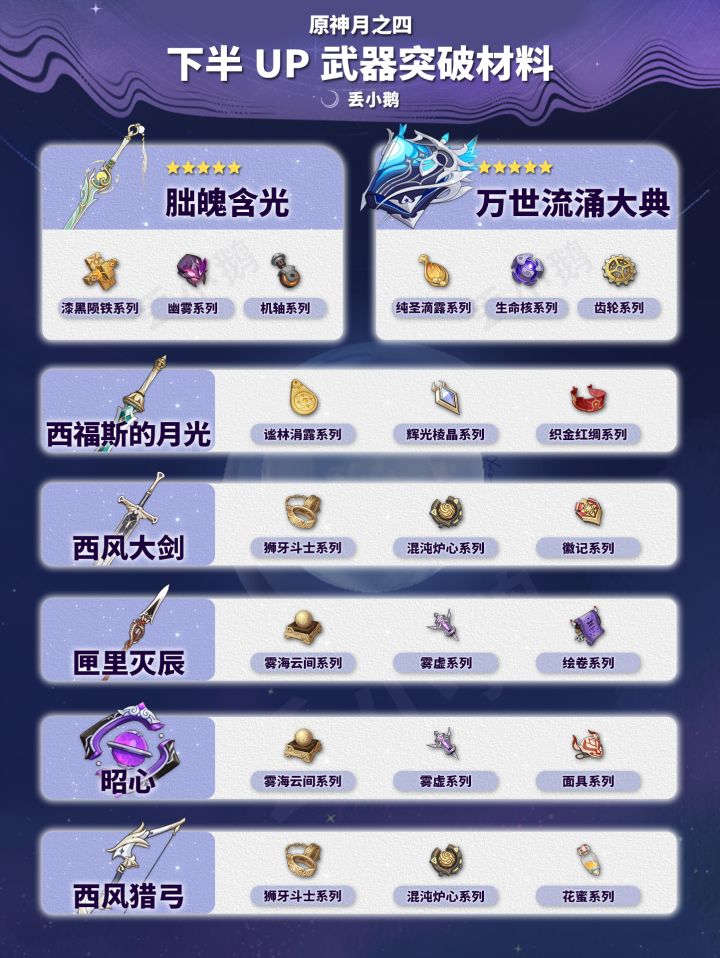 旅行者好,我是丢小鹅~为你带来原神「月之四」下半Up武器突破材料~● 5星武器:「单手剑·朏魄含光」(新)、「法器·万世流涌大典」● 4星武器:「单手剑·西福斯的月光」、「双手剑·西风大剑」、「长柄武器·匣里灭辰」、「法器·昭心」、「弓·西风猎弓」#原神 #原神攻略 #原神创作者激励计划 #原神月之四 #兹白 #那维莱特 #叶洛亚