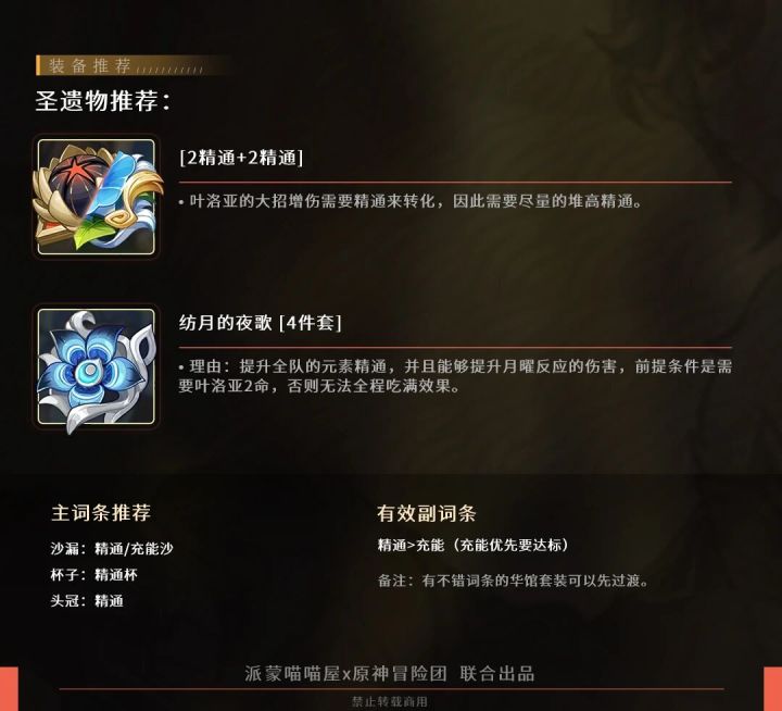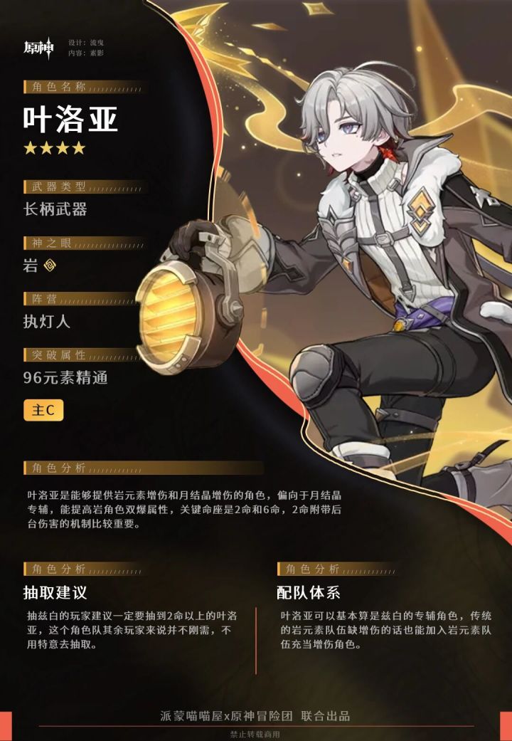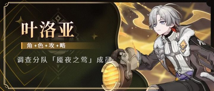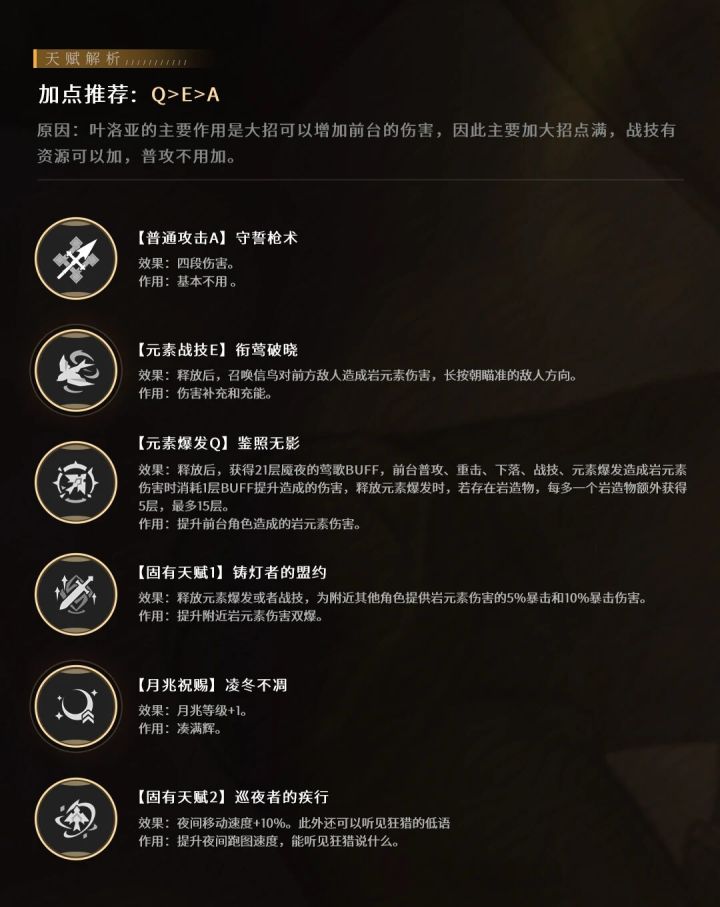 uid:100047993执灯人的小队长叶洛亚登场了,他是月结晶的辅助,来看看要怎么培养吧~▌P1 角色定位▌P2 天赋技能天赋分析[普通攻击A]效果:四段伤害作用:基本不用[元素战技E]效果:召唤信鸟对前方敌人造成岩元素伤害,长按瞄准作用:伤害补充和充能[元素爆发Q]效果:释放后获得21层魇夜的莺歌BUFF,前台造成岩元素伤害时消耗1层BUFF提升造成的伤害,若存在岩造物