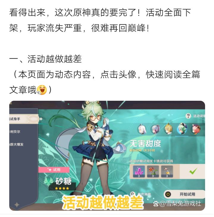 不知道说点什么好了,该死的仓检。为了补草神二命,648+98+60+之前的存货+肝了两个晚上。结果,76歪琴,目前79还没出货。玩着真痛苦,又臭又长的剧情,晕人的地图,永远刷不出也升级不到点的圣遗物。还有往期基本上一遍就满星的深渊如今也越来越折磨人,两队十四五金加上全员圣遗物完美毕业的练度硬是凹了二三十遍才满星。😭😭😭