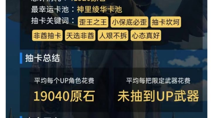 关于我玩原神。其实吧,我发现有时候非酋也是一种一种特别,特别到什么程度,就我从21年8月开始到现在,保底就没稳过,就那种非到狗都想嘲笑我。你们知道作为非酋的感受吗,现在只要有池子,我都得准备多份儿的原石,才敢抽,我已经从抽不到角色在厕所痛哭到现在看着小保底就能隐约感觉到老卢头和牛杂师傅在向我招手。还记得上个池子抽了心海,不为别的,就好看。哎,别的不说了,还是祝大家单抽出金,十连双簧