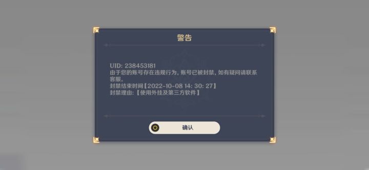 UID238453181 官服 账号被误封账号被误封一个月,官服给出的理由是使用外挂及第三方软件,如果米游社算是第三方软件的话我没有任何问题,本人只在米游社攻略下寻找过清心材料,以及异地登录过游戏,可能系统识别到IP地址变换异常,就选择封禁,但本人是大学生,临近开学去学校,因此异地登录,所以属于误封行为,希望官方处理一下,谢谢