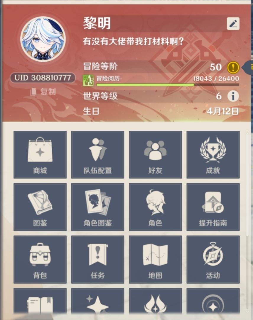 有人带我打材料吗?这个是我的UID308810777