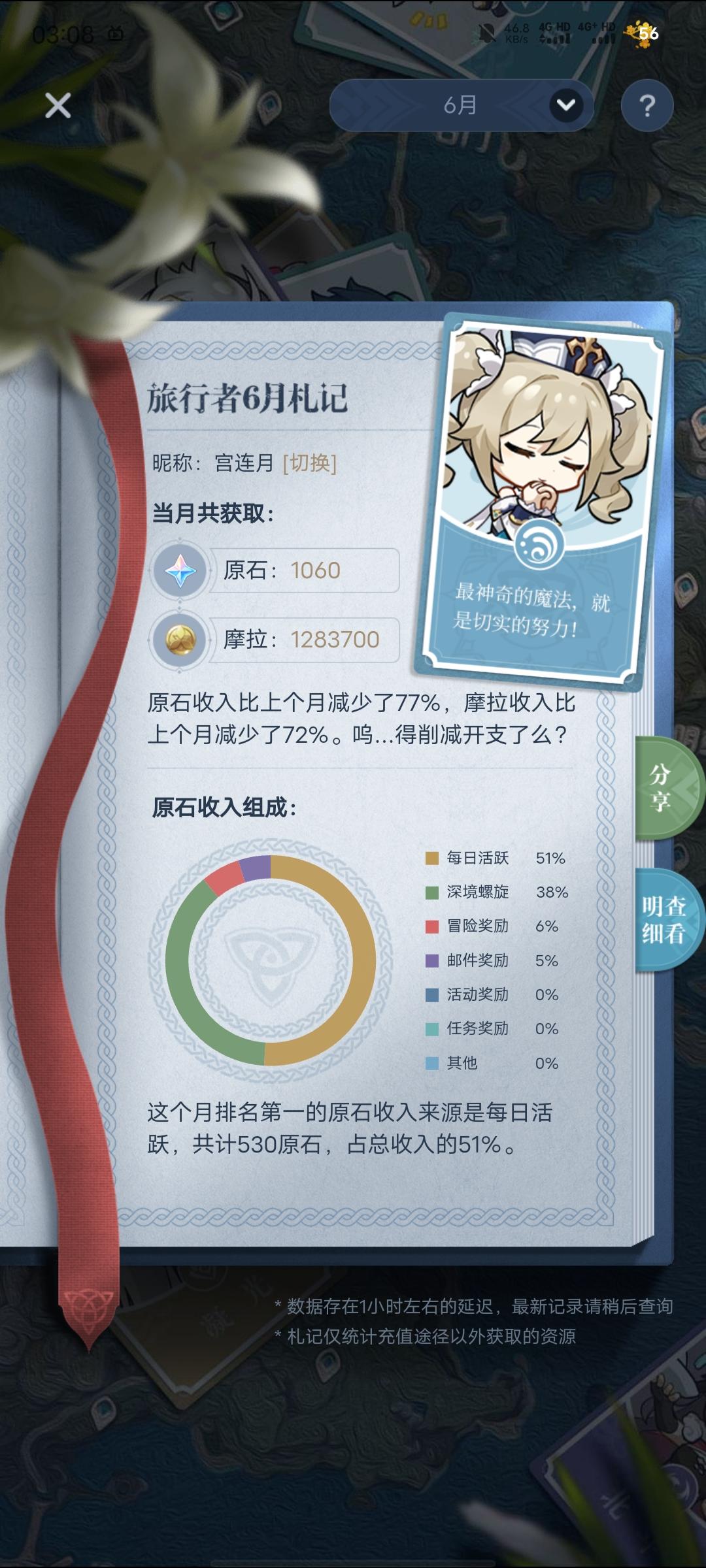 累了,玩不动了,地图什么的都是自己肝的,没看攻略,肝满须弥以后就没动力了,现在是大保底60多抽,送给想要认真玩的,拿到了也请好好对待