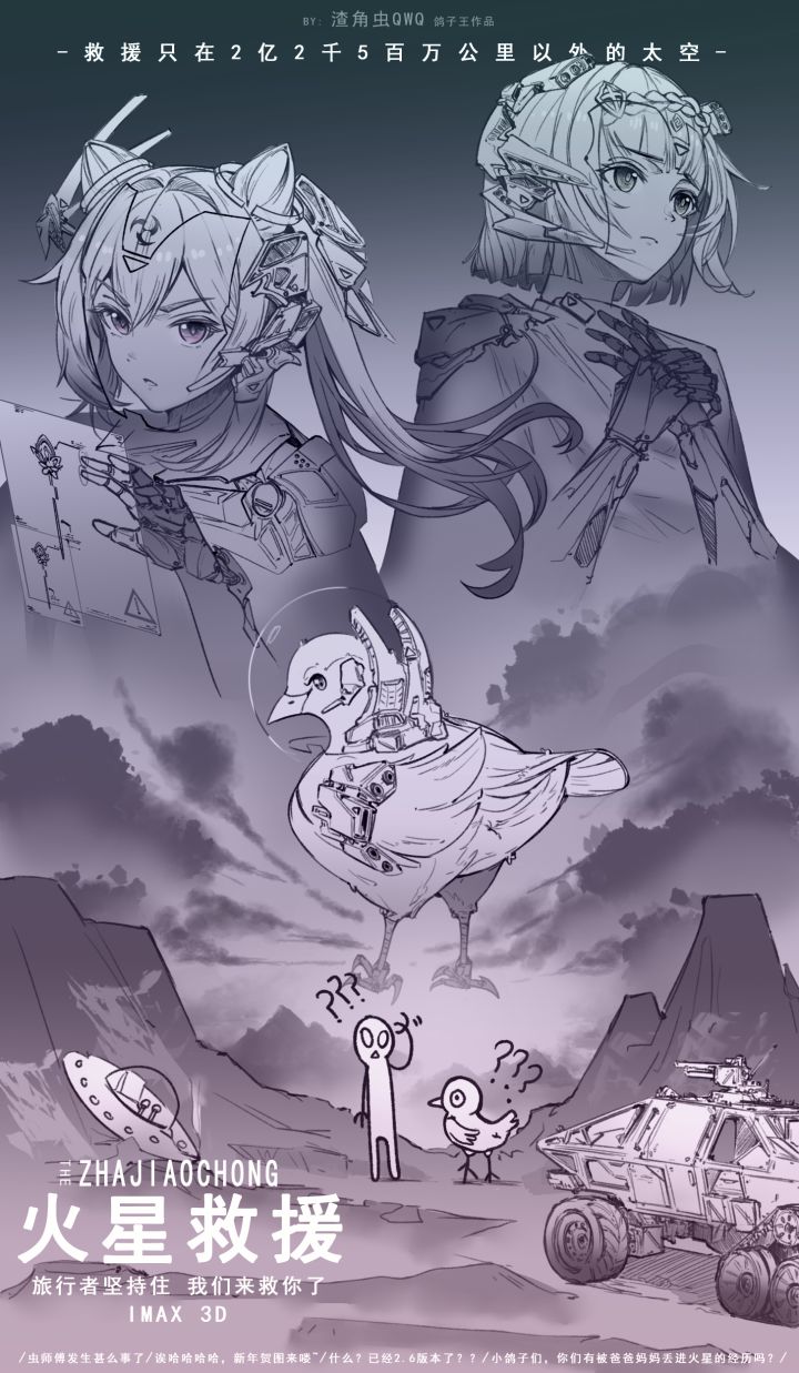 【原神】在火星上进行一个2.4新年贺图的画“火星上的你,再能鸽也是假的,不是真的,所以不要贪玩迷恋”没想到鸽了这么久,在2.6到来之际才涂完2.4的图,虽然有亿点点晚,但是鸽角虫在这里还是要祝大家虎年大吉(●'◡'●)~(PS:这次涂了一个火星的小剧场,另外多画的服装没有细细打磨和认真思考,基本上是乱画的,画工比较粗糙和不成熟,还是一如既往的希望大家可以多多包涵இ௰இ~)