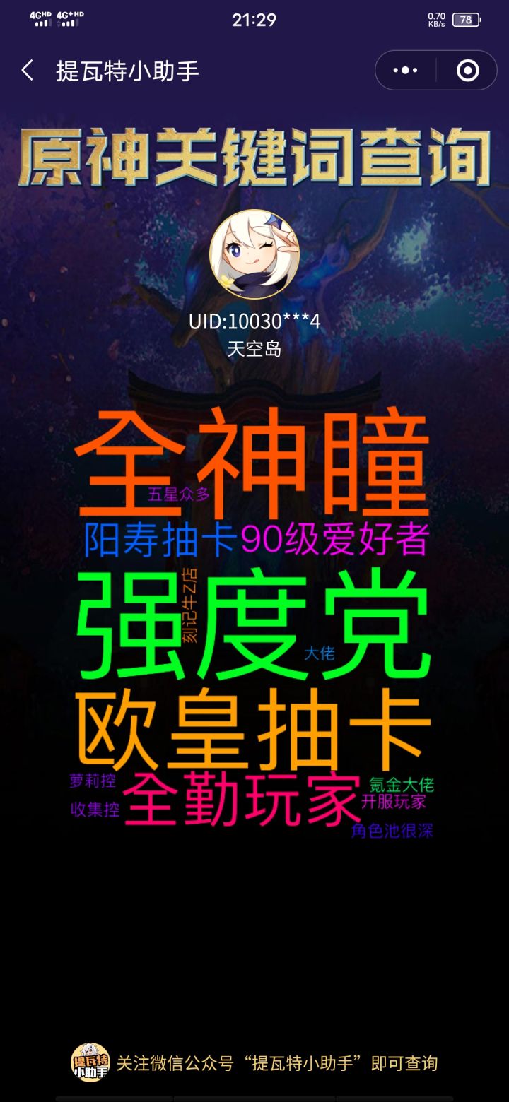 胡说,我才不是萝莉控。我明明最喜欢菈宝。这个强度党认真的吗?我角色练度最高的是优菈,能下深渊不?最常用的是可莉,强度也不高啊。雷神神里刷了一套主词条对的就没咋理了。这也算强度党吗?非要说我觉得自己是XP党。还有这个欧皇认真的吗?明明最近万叶还是大保底,武器没有一把专武。全勤玩家?我阿贝多池子退坑的,退了好久了。角色池很深?我钟离,阿贝多,一斗,夜兰等等都没有。氪金众多?两千多我也觉得不算多,三蹦子我都氪了好几万了。米忽悠的游戏一万以下不都算零氪吗?大佬?我还是个小萌符合我。新,深渊都打不满。目前也就开服玩家,刻记牛Z.店跟90级爱好者还有搜集控符合我。