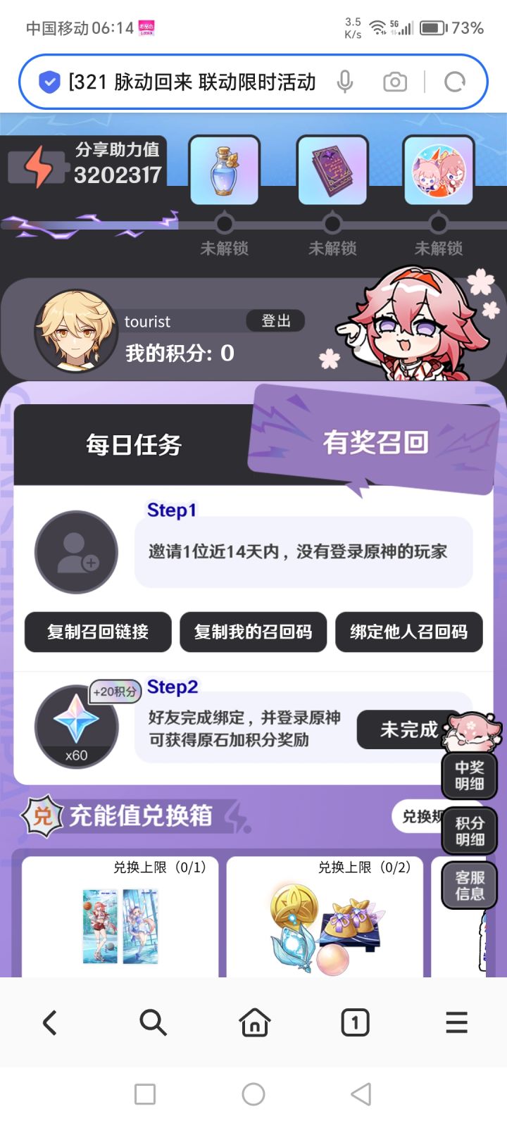 回归玩家进入活动后输入邀请码可以获得原石奖励。邀请码:CA9BNPV4XN活动助力链接https://mhyurl.cn/gPhO34AdU?i_code=CA9BNPV4XN