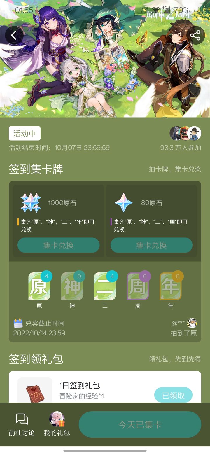 2020年10月8日,异世的旅行者来到了提瓦特大陆。跨越尘世的探索之旅,就此启程。旅行者累计在提瓦特大陆上活跃了 569 天。2021年6月29日,枫原万叶加入了旅行者的队伍。旅行者与枫原万叶共同在秘境中战斗了 213 次。截至目前,一共有 36 位伙伴加入了旅行者的队伍。【原神】参与「绘忆星辰」活动,分享你的旅行回忆,可得原石等游戏内奖励! https://webstatic.mihoy