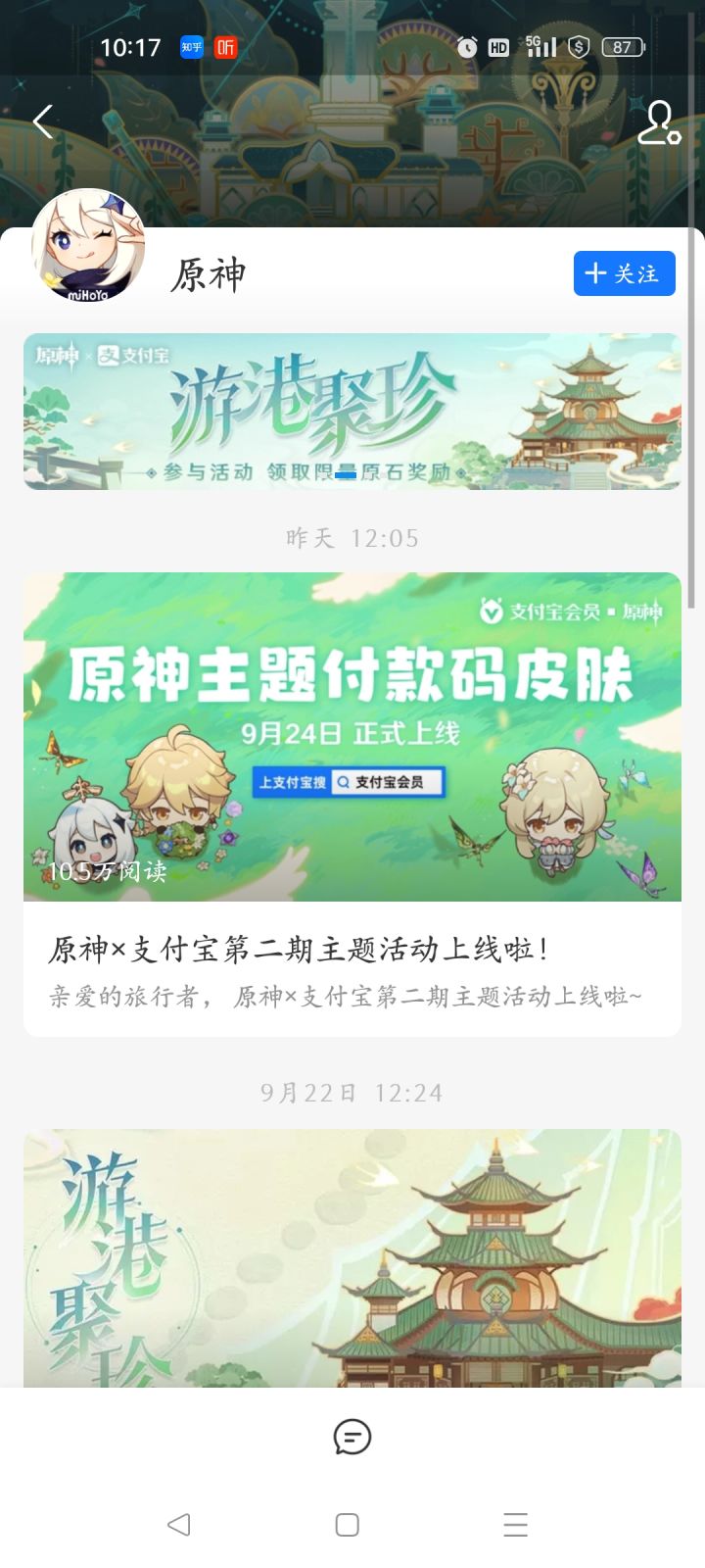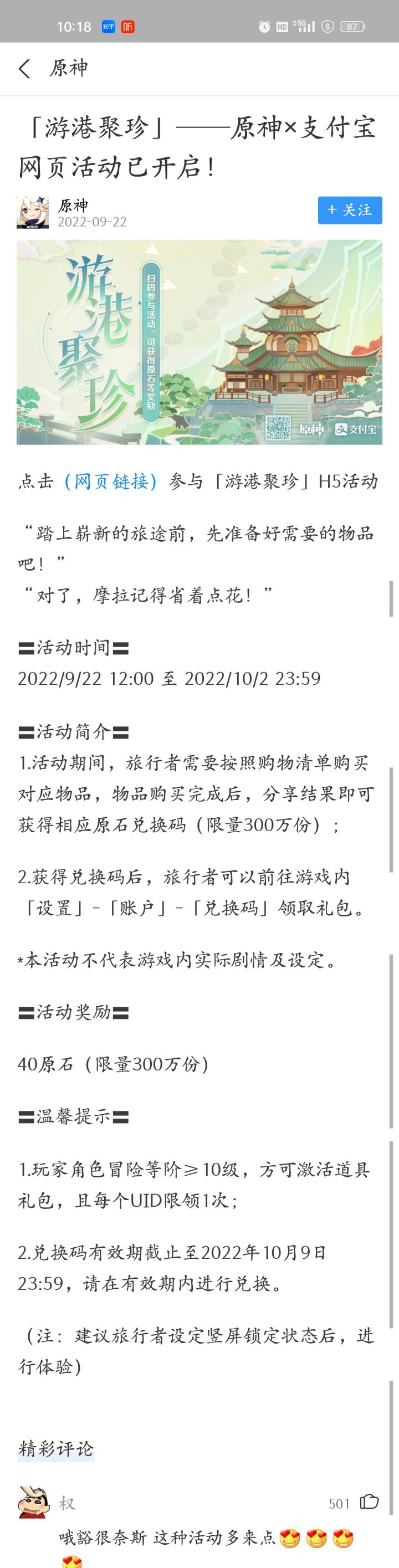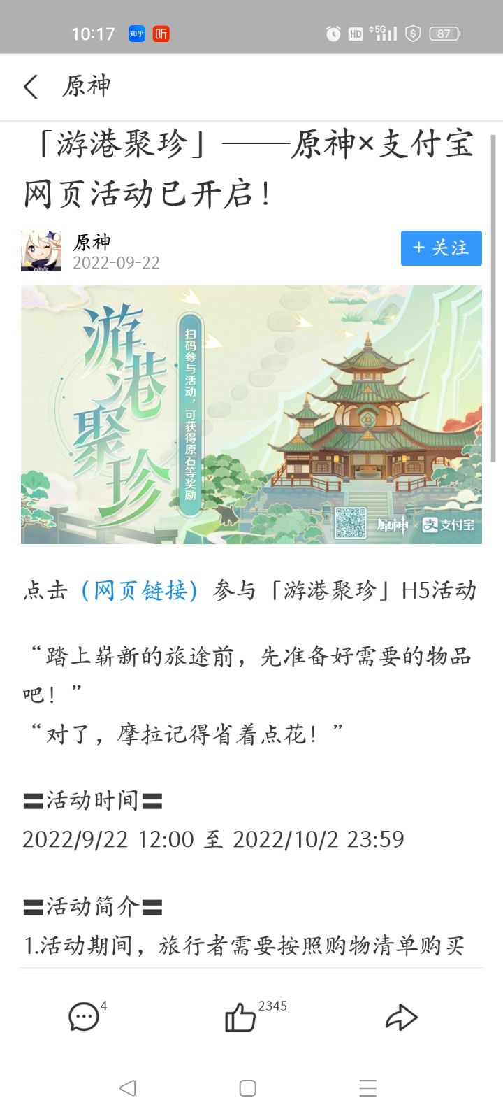 原神现在正在和支付宝做活动。 进入游巷聚珍可以分享获得40原石,限量300万份。活动时间:2022/9/22至2022/10/2,具体请看以下图片。进入时记得点击网页链接。(地点:支付宝中第三张图片的蓝色部分)