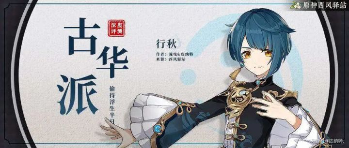 偷得浮生半日闲——古华派行秋 减抗、脱手、恢复香不香?副C还有高伤害想不想拥有?那么你可就找对人了,「古华派」行秋符合了以上的所有要求,双技能都可以脱手挂水,并且有着减抗以及少量恢复能力保证战斗中的血量不会过低。♢ 在这些前提下还有着一点不逊色于主C的高额伤害,可以搭配目前提瓦特大部分主C,可谓是真正的万能辅助,王牌工具人。♢ 璃月港「飞云商会」里有一位名为行秋的少爷,作为「飞云商会」的二公