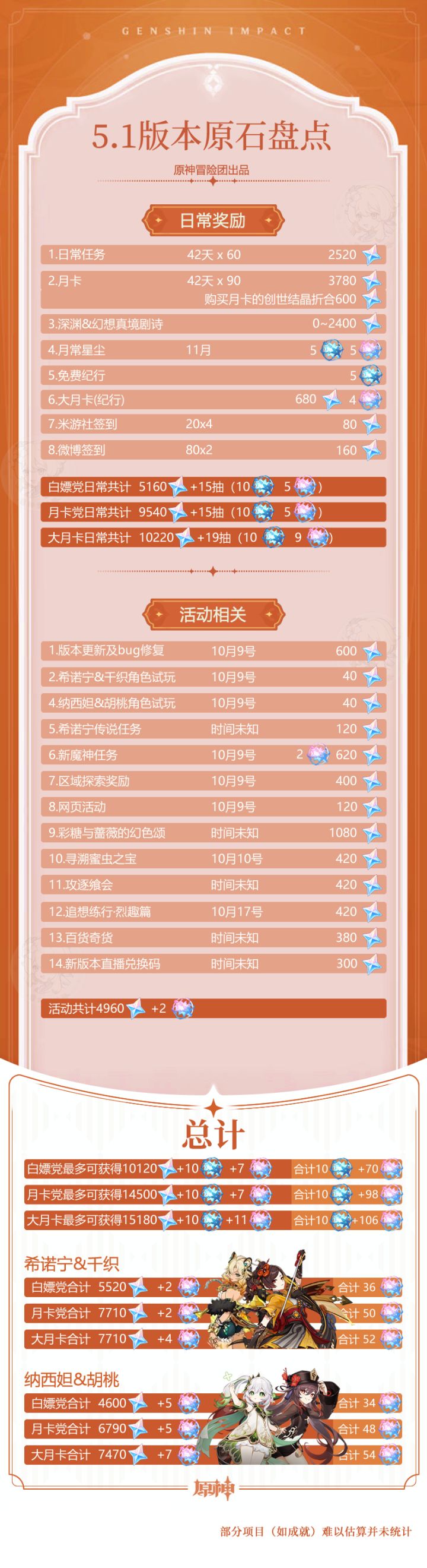 uid:1000479935.1版本即将更新,我们根据已有的信息对5.1版本获得的原石数量进行了计算,每部分还有详细依据,方便大家心中有数统计范围从10月9号版本更新开始,以版本持续42天进行计算,希诺宁&千织池,纳西妲&胡桃池情况也分别进行了统计,月卡/纪行作为一个可选项列在表中。未知成就等难以统一的部分未列入表中,所以预计大家实际能够获取的原石数量会比统计数高一些。相关说明1、统计时深境