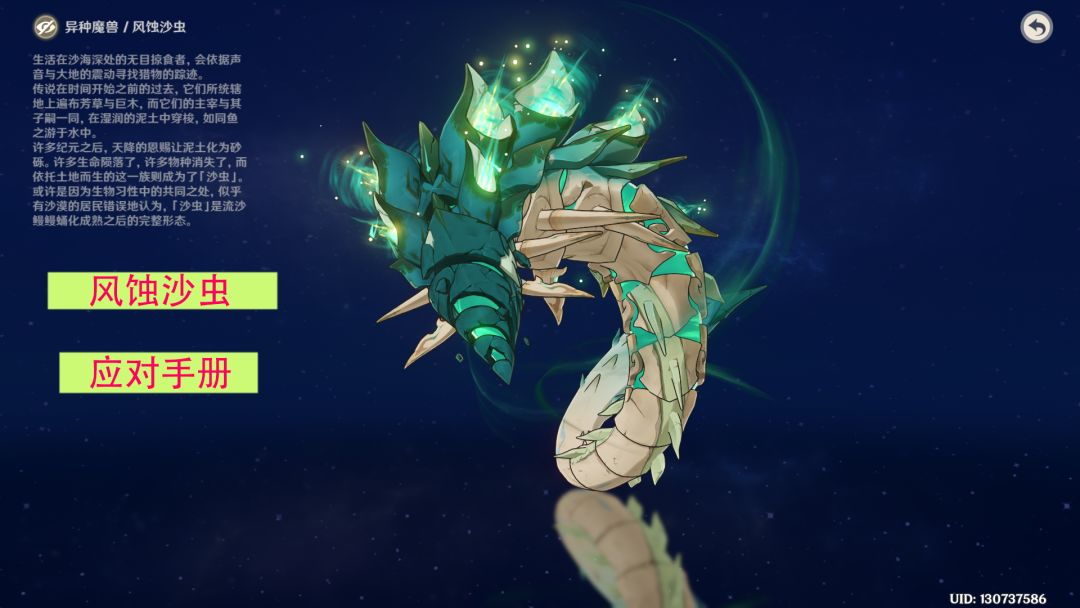 UID:130737586 终于,策划把风蚀沙虫放进了深渊,成功让部分玩家开始怀疑人生了。在不了解沙虫特性的情况下,玩家在队伍搭配或是输出手法上可能会有些不合理,导致不好拿满星。本期攻略就一起来看看沙虫的一些特性和攻击模式。 -----------------分割线----------------- 一.风蚀沙虫 风蚀沙虫(以下简称沙虫)是生活在须弥沙漠地区一种顶级掠食者,元素属性是风元素#攻略