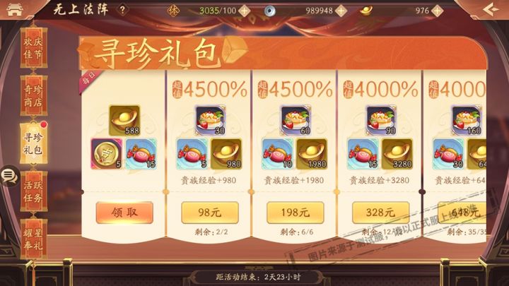 少年们,晚上好哟~ 富甲天下神兽商店更新,天金神兽晖焕龙马加入! 化身商店同时开启,第五代天金将化身符限时兑换! 话不多说,且随乔乔一起看看吧~ 精彩抢先看❀富甲天下开启,晖焕龙马首次加入神兽商店❀身外化身,第五代天金将化身符限时兑换❀ 富甲天下❀活动参与时间:2023年12月29日00:00-2023年12月30日00:00活动天数:1天开启范围:开服大于等于8天的服务器均可参与活