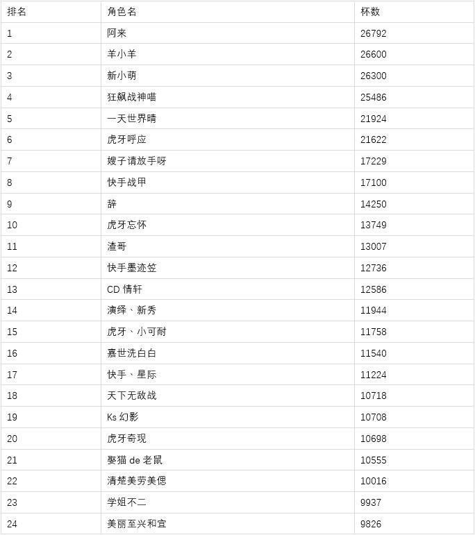 亲爱的喵们,这个夏天由我来Carry!本期的杯数挑战赛活动圆满结束啦!感谢各位小伙伴的参与和支持,排行榜总杯榜前50名的喵们可以获得本期活动对应的奖励哦!我们会在7月23日通过游戏内邮件陆续发送对应奖励给到获奖的各位喵们,届时请大家及时领取邮件奖励哟!下面是获奖玩家公示:【活动时间】2021年7月2日10:00-2021年7月18日24:00【活动说明】全服玩家中,排行榜总杯榜前50名的