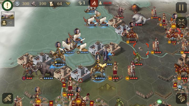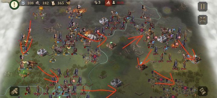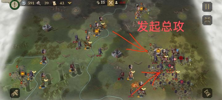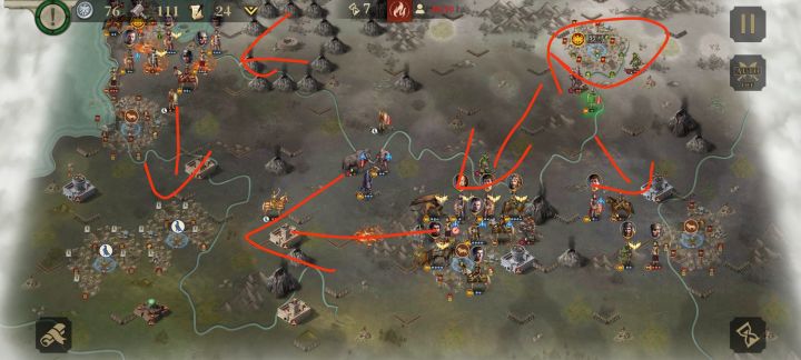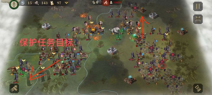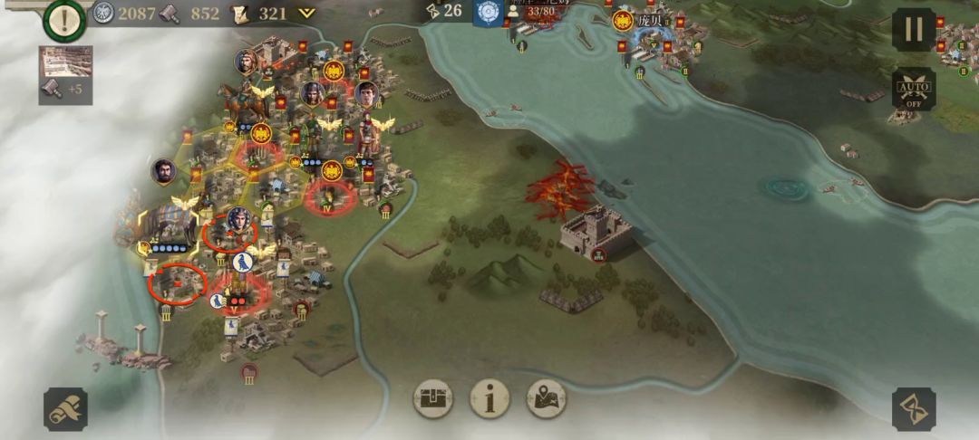 随后兵种放置位置如图5所示,给霍将军一个急行军,移动到图6位置干掉弓箭手,(庞培下面是哥布林),随后跳过该回合,可以发现敌方贝利撒留,比蒙兽和独眼巨人到上面去准备堵我们如图7,然后放他们鸽子,只留一个弓箭手在上面迷惑他们其他兵全部下来支援,当占领第一个关键地区时对面贝利撒留和独眼巨人会下来,占领第二个比蒙也会下来,时间紧迫,莽一点不要怕,让哥布林上岸并用一个急行军移动到祭坛处,放火并攻击如图8,这样祭坛掉血贼快,随后让霍将军和其他兵或神怪围住祭坛不让它刷兵,然后直接开干,注意相互支援。占领两个关键地区后留布雷比斯塔和秦俑轻骑兵,弓箭手守家,升级城池增加人口上线招兵买马,其他将领直接往右推过去,猛犸象和霍将军,阿米尼乌斯打汉尼拔和凯撒,庞培和指挥官从最右边向上(当汉尼拔被搞死后对面庞培会下来)接下来只要守住就可,到后面是可以招兵的不要怕