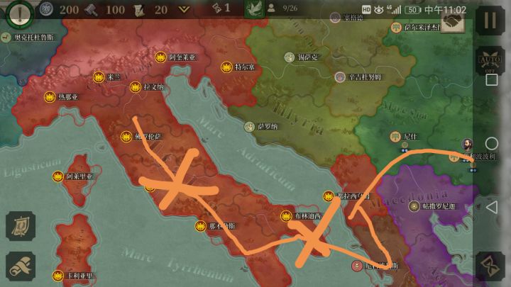 这张图是大致路线,红叉表示可以固守布林迪西,可以让你不用过海就可以打罗马,至于罗马,撒盐 手动滑稽。 外交拉马其顿,伊比利亚。每回合结束时要留100块钱,中立国会要你收入加上100元。征1流氓很强。这是凯撒大佬告诉我的。有两种思路,一是分兵,打罗马和昔兰尼。2是守住东线,打钱,等图爹来打罗马。 第一次写攻略,请各位大佬指征我的错误。