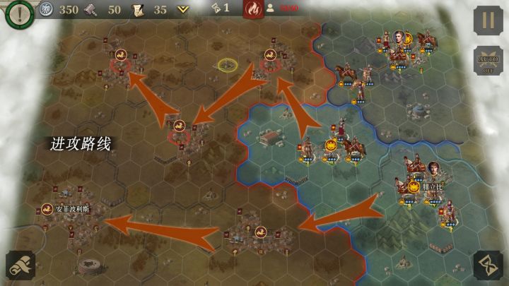 今天带来战役支线第十章的攻略思路,欢迎各位指挥官留言讨论~第十章 解放者内战 支线 - 罗马共和国第一关:联军的登陆本关的目标是占领3个关键地区,击败3支关键部队,经济达到2000。由于本关有经济要求,前期要多占城注意运营。部队分成两路,右下角部队占领地图下方两座城,上方部队去进攻3个红圈城。3个关键部队在2个红圈城附近。黄圈是2张精准卷轴。左上角的红圈城等条件达成后最后再占。第二关:屋大