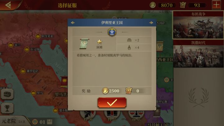 开局直接把兵派出去去打埃托利亚的两个城 直接去打城 很轻松拿下 之后生经济 把兵全派到昔兰尼去打主城 这个时间点千万要记住 不要爆兵 有一队守城就行 看看左边的两位大哥要是罗马方兵压过去了就给他们经济给到他们兵压过罗马了就行 注意奥德李西亚 和伊利里亚打不过罗马的 记得给他们分经济 主要是给奥德 不能让他被灭 可以适当出兵帮他们分担压力 等到昔兰尼被后方全部生经济和人口 开始在主城爆兵 钱多了记得