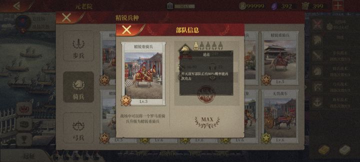 所有精锐骑兵升5级都会有一样的通用被动歼编80%再动,是三大兵种中最好用且强化幅度最大的通用被动。顶级骑兵顶级骑兵可以升6级,有一通用被动,外加一特殊被动,但只有战车的被动比较实用虎贲羽林卫队特殊被动减60%防御,本次攻击不生效,而且由于本作的防御计算公式,22点护甲的敌人下次攻击才10%左右加伤,不是很强面板轻击重甲中规中矩塔尼特战象特殊被动减30%攻击,本次攻击不生效,主力就算