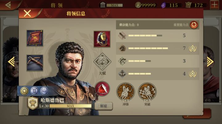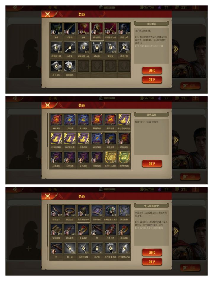懒得玩了。没通关英雄传奇也不想打了。装备看将领在战斗中表现随缘给。主力:庞贝,贝利,屋大维。这仨阵亡了基本失败在路上了。