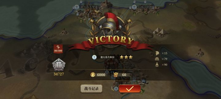 复活军团最后一关,真是变态,虽然我唯一一个一次三星过的,太极限了,最后一个击败部队竟然是祭坛,找了半天慌得一批,还好有小鸟和大象,光汉尼拔也无力回天。可以去玩征服战役咯,直接神装拉满开局美滋滋。