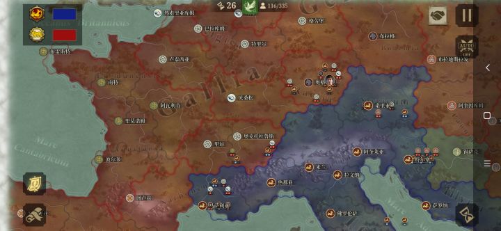 6月份第一次碰,选的本都打了半天,蓝色阵营只剩下图里面显示的了,缩在土耳其动弹不得~现在终于时代变了,内尔维帝国 终于可以反过来锤死曾经的lj盟友屋大萎