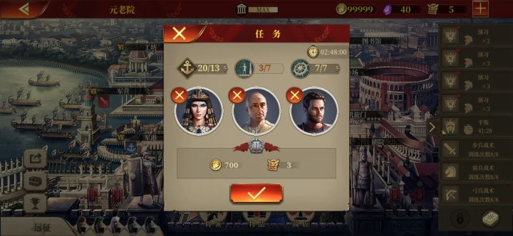 为什么还有这样的任务。都二十九将时代了。为什么还不多出一点将。有的时候不是我们不买将,是武将真的不兼容。无法满足我们的需求,尤其是海将。毕竟在远征,在决战模式中,艳后和阿格里帕,小庞贝,光头,四个将太少了,希望最少要有五个能用的,能满足简单的整容替换。在任务方面,希望能改进任务 ,毕竟不是任务没有武将是因为培养不够,而是没有有技能兼顾的武将。