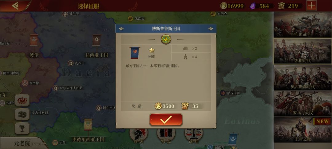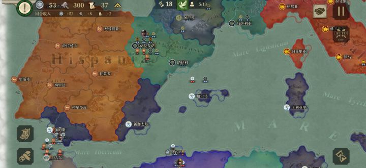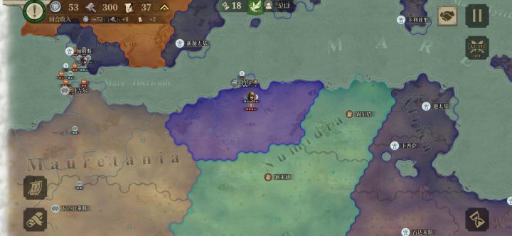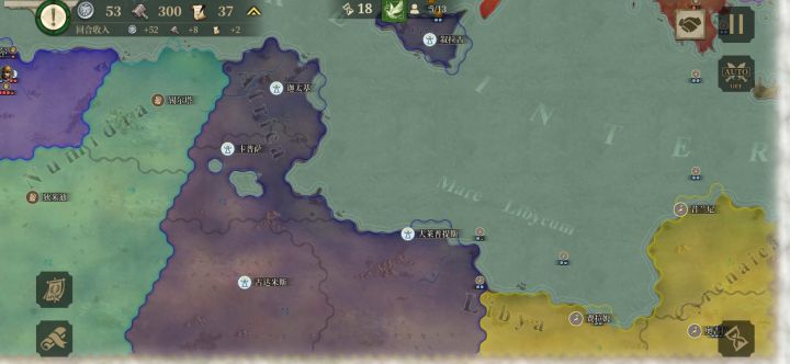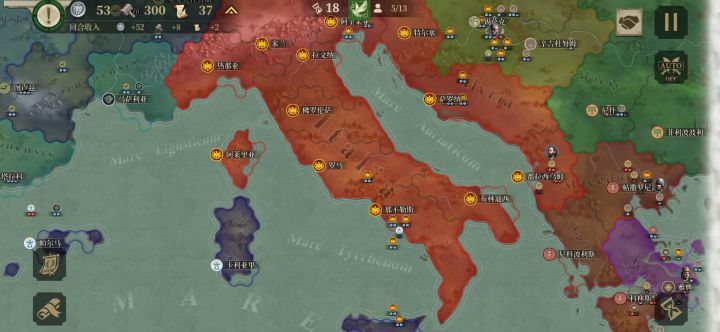 我原先上传了玩博斯普鲁斯王国到第48回合贴子,我打算“重开”这局,但凭借一些经验我相信就算打超60回合,只要有把握就能打成顺风局,照样金质评价。2月15日玩的,我开始兑现我的有把握的“放话”,一星国博斯普鲁斯王国。在我失去两名将领后,我从现克里米亚半岛出发一路向西,兵分三路,一路从亚平宁半岛下方登陆,一路从上埃及打到直布罗陀,另一路从东欧平原出发。我先与周边盟友歼敌军,待平定后我掉头,调点兵