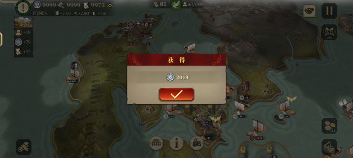 罗马与大汉征服里,大汉右下角有一个与大汉敌对的一城小国,它叫阿尔巴尼亚。一城开局确实人口很急,而且这个国家没有特殊兵种,只能靠属性一般的重骑兵和轻甲弓箭手推图(弓指极度不适),没有强力的弓箭手兵种,推图确实十分拖沓,六十多回合直接俩小时的假期过去了。这个图的日德兰半岛上面的一个城里有2019银币的小彩蛋