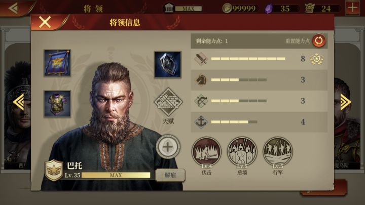 版本新宠-巴托由于新版本的朱庇特战旗更适合庞培,替换下的雄鹰战旗,自然非巴托莫属,盾墙和行军被强化后使得巴托腿长且肉更有伏击防反,单论生存能力步兵中无人出其右,很多战役中作为2步出场比维胡子克拉苏更合用。