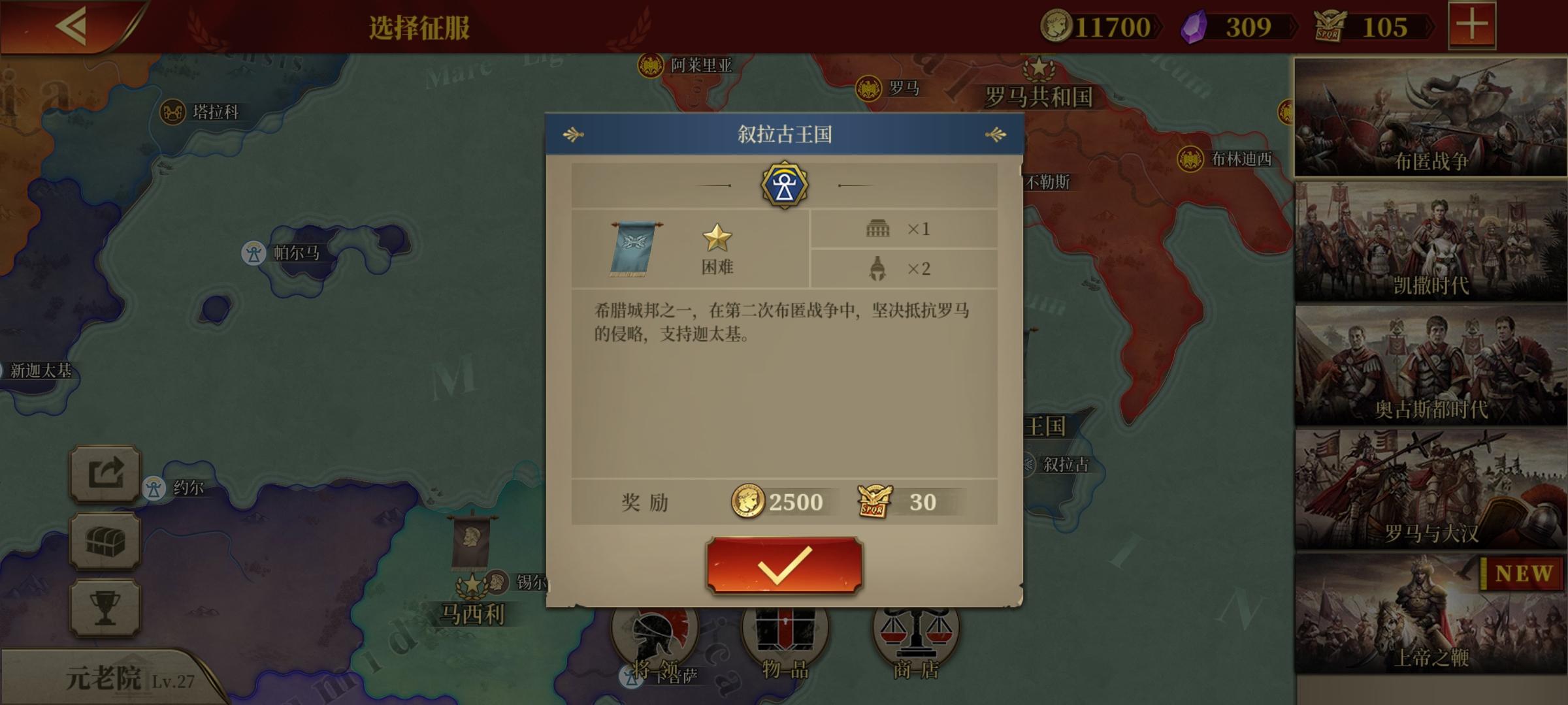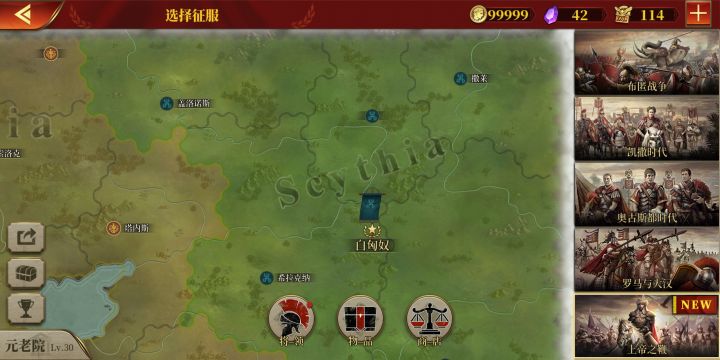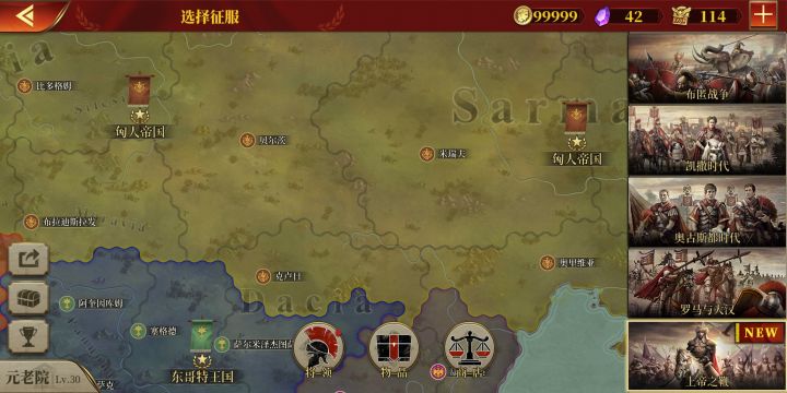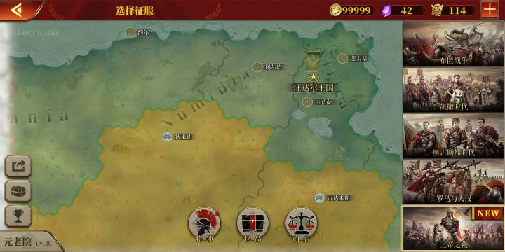 攒金币,休闲布匿战争、迦太基,这次我见势全部盟友+敌人一并吃了,三星国超过30回合,得金,可以。