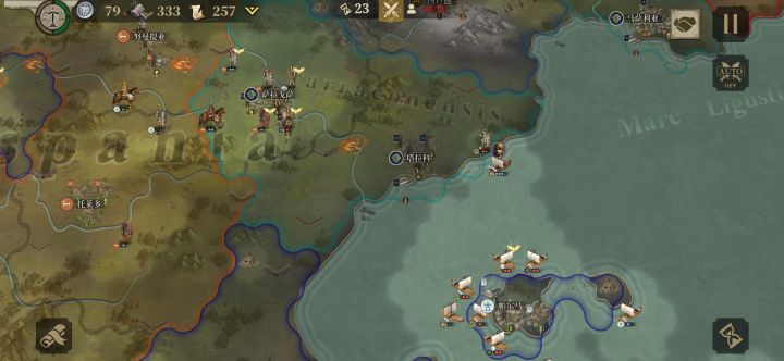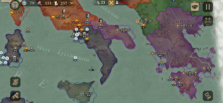 马西利,在地区大国迦太基、罗马共和国夹缝中求生存、发展。我向下的念想被迦太基掐断了,所以宣战中立象,然后挺进地中海,见势占领罗马,基本扭转了战局,与迦太基争夺、平分战场主动权又不过送资源给它,一起撑;后秉着见好就收的原则,在巴尔干地区接连宣战盟友马其顿、奥德里西亚王国(因为它离雅典很近,不希望灭亡马其顿的国家,灭亡罗马的头衔都被它抢走,雅典不能让),地中海小国叙拉古,跨海领土扩大了2倍,迁都罗马