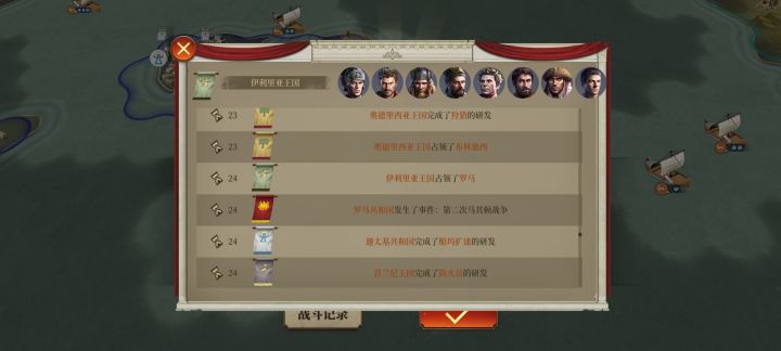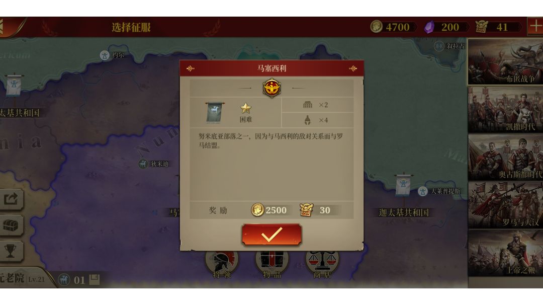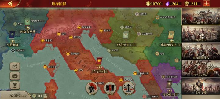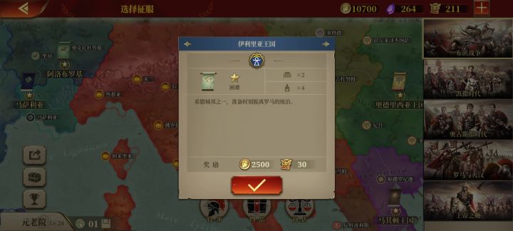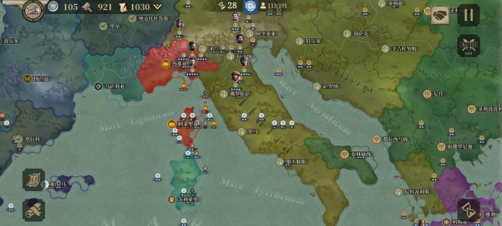 征服,布匿战争剧情,这次我玩马塞西利。 1.我先灭马西利 2.灭亡马西利,造一个轻骑(安东尼),往迦太基北非一个据点约尔打去,灭亡马西利准备夺迦太基的北非大本营。 2.造一个重骑(汉尼拔)往丹吉尔打去,然后造一个斯巴达克斯守迦太基,造一个重骑(贝利撒留)与占领迦太基的兵往北非西南方打。 3.安东尼试探性占领迦太基在伊比利亚半岛的重镇新迦太基城,紧接着汉尼拔与骑指(重骑)配合占领了迦太基最后一个据点,加的斯,迦太基战败。 4.造一个神箭手(凯撒)与斯巴达克斯(重步),灭了叙拉古王国。 5.伊比利亚方面,与盟友配合灭图尔德尼泰,但其中一个盟友抢我胜利果实,我把兵集结后向苏埃塞塔尼宣战,灭苏埃。 6.我先后向盟友普兰尼王国、阿洛布罗基、马萨利亚宣战。 7.最后,我豪赌一把宣战盟友罗马。